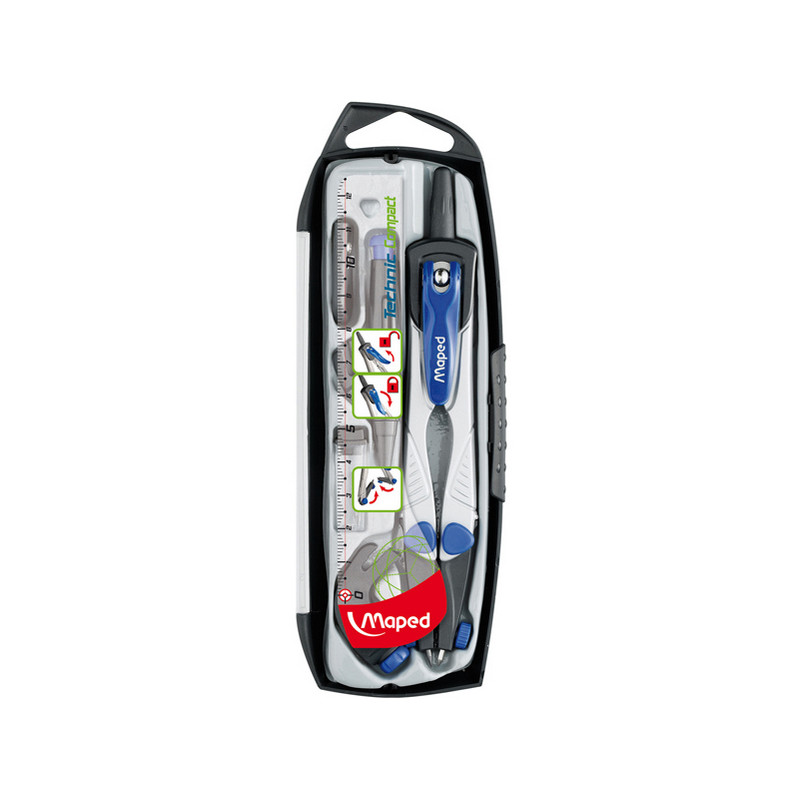 Compasso composto da 5 pezzi: 1 compasso mina, 1 adattatore universale, 1 portamine da 0.5mm, 1 temperamine, 1 astuccio mine. Brevetto StopSystem con bloccaggio delle aste. Aste pieghevoli per riporlo in modo compatto e sicuro. Diametro massimo 360mm. Lunghezza compasso 15cm. Astuccio in plastica.