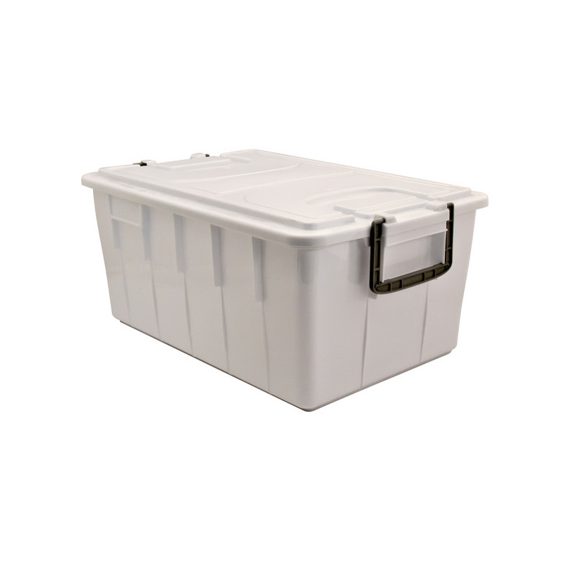 Contenitori food box con coperchio. In polipropilene riciclabile. I contenitori sono sovrapponibili con coperchio e impilabili senza coperchio. Dotati di manici. Idonei al contatto con alimenti. Colore bianco. Dimensioni: L58 x P38 x H26cm - 40 litri