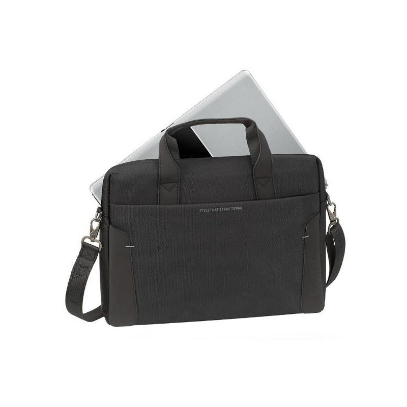 Borsa per Notebook da 15,6' compatta e sottile, compatibile con Notebook fino a 15,6'; imbottitutura in matgeriale antiurto per la massima protezione; compartimento interno separato per documenti e piccola tsca interna; doppia tasca esterna per accessori quali tablet o smartphone; doppia cerniera per un rapido accesso rapido e facile; comoda tracolla removibile antiscivolo e maniglie ripiegabili all'interno. Materiale: Poliestere. Colore Nero. Dimensioni interne: 380x290x50 mm. Dimensioni esterne 410x310x70mm. Peso: 950 gr.