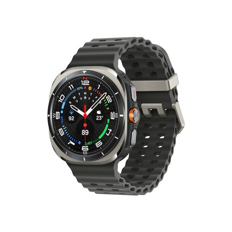 Samsung Galaxy Watch Ultra. Dimensioni diagonale schermo: 3,81 cm (1.5"), Tecnologia display: AMOLED, Risoluzione del display: 480 x 480 Pixel, Touch screen. Capacità RAM: 2000 MB, Memoria flash: 64 GB. Wi-Fi. GPS (satellitare). Capacità della batteria: 590 mAh. Peso: 60,5 g. Colore cinturino: Grigio. Sistema operativo incluso: Wear OS