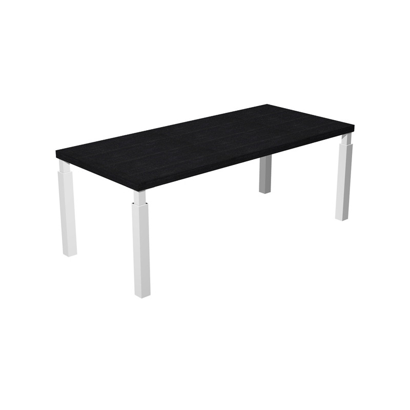 Scrivania direzionale con quattro gambe in metallo a sezione quadrata complete di piedini regolabili in altezza per un perfetto livellamento. Le gambe hanno sezione 70x70mm sul fusto e 40x40 mm nella parte alta e si agganciano al desktop ognuna con una robusta piastra metallica. Desktop (sp. 38 mm) con bordo antiurto in ABS (sp. 2mm). Le gambe, in entrambe le versioni di colore, sono impreziosite da dettagli e particolari cromati.