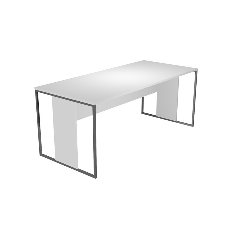 Desktop in melaminico bilaminato sp.22mm con predisposizione per l'alloggiamento di n.2 anelli passacavi opzionali (bordo in ABS sp.22mm) Modesty panel strutturale in melaminico bilaminato H35cm (sp.18mm). Gambe ad anello in metallo a sezione quadrata 20x20mm verniciate a polveri epossidiche complete di piedini regolabili iin altezza e montante strutturale in melaminico bilaminato di lashezza 30cm (spessore 18mm).