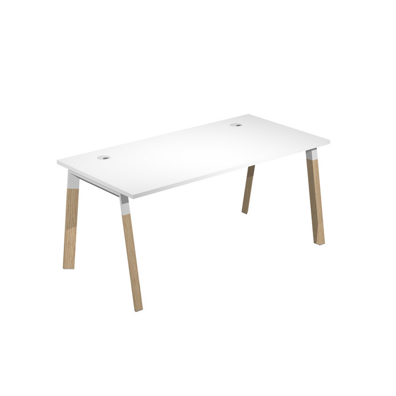 Scrivania con gambe bimateriale in metallo e legno massello. Spessore 25mm. Con due anelli passacavi diam. 80mm. Dimensioni: 160x80x72,5cm. Piano bianco.