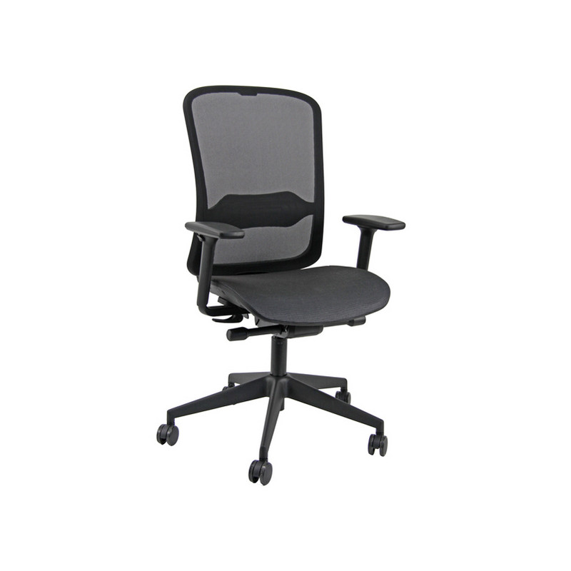 Sedia girevole su ruote con sedile in rete portante e schienale in rete nera, elevazione a gas. Supporto lombare regolabile, meccanismo syncro tra sedile e schienale, a contatto permanente. Schienale con ritorno controllato con 4 blocchi antishock. Sedile dotato di traslatore (avanti e indietro). Completa di braccioli regolabili. Alt.tot: 105-107cm; Prof.tot: 68cm; Alt.schienale: 60cm; Largh.schienale:47cm; Largh.sedile: 48cm; Prof.sedile: 46cm; Alt.sedile: 40-52cm.