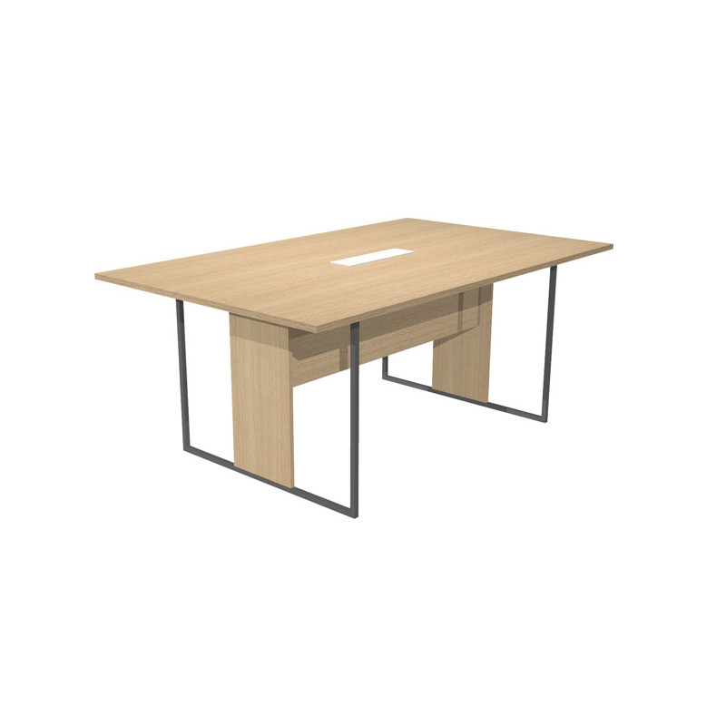 Desktop in melaminico bilaminato sp.22mm. 2 modesty panel strutturali in melaminico bilaminato H35cm (sp.18mm). Gambe ad anello in metallo a sezione quadrata 20x200mm verniciate a polveri epossidiche complete di piedini regolabili in altezza e montante strutturale in melaminico bilaminato di larghezza 30cm (spessore 18mm). Larghezza gamba 90cm. Tavolo riunione con top access L180xP110xH74,4cm