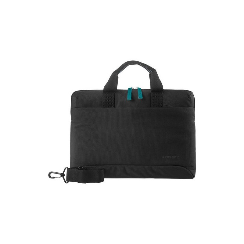 Borsa super slim in materiale tecnico con dettagli in contrasto colore per laptop. Vano interno unico con orecchie in neoprene per bloccare il dispositivo. Il lato anteriore è dotato di una ampia tasca esterna. Tracolla removibile e manici doppi in nastro.