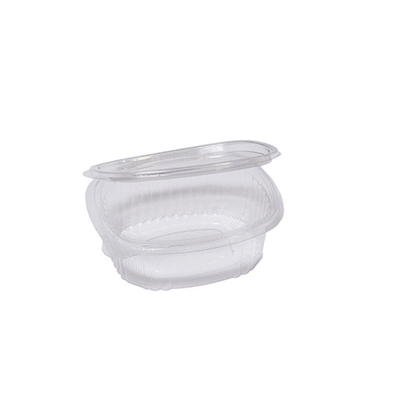 Contenitori ovali in PET con coperchio incernierato. Ideali per cibi freddi, con conservazione in frigo e freezer.