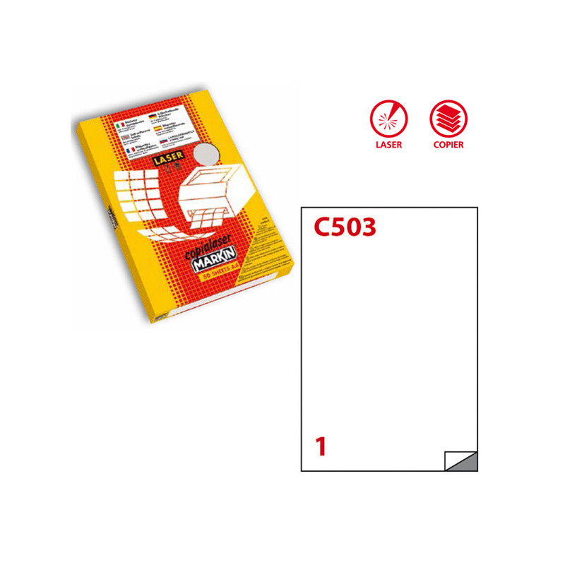 >Cancelleria>Etichette>Etichette adesive C/503 - in poliestere - permanenti - 210 x 297 mm - 1 et/fg - 50 fogli - bianco opaco - x laser - Markin