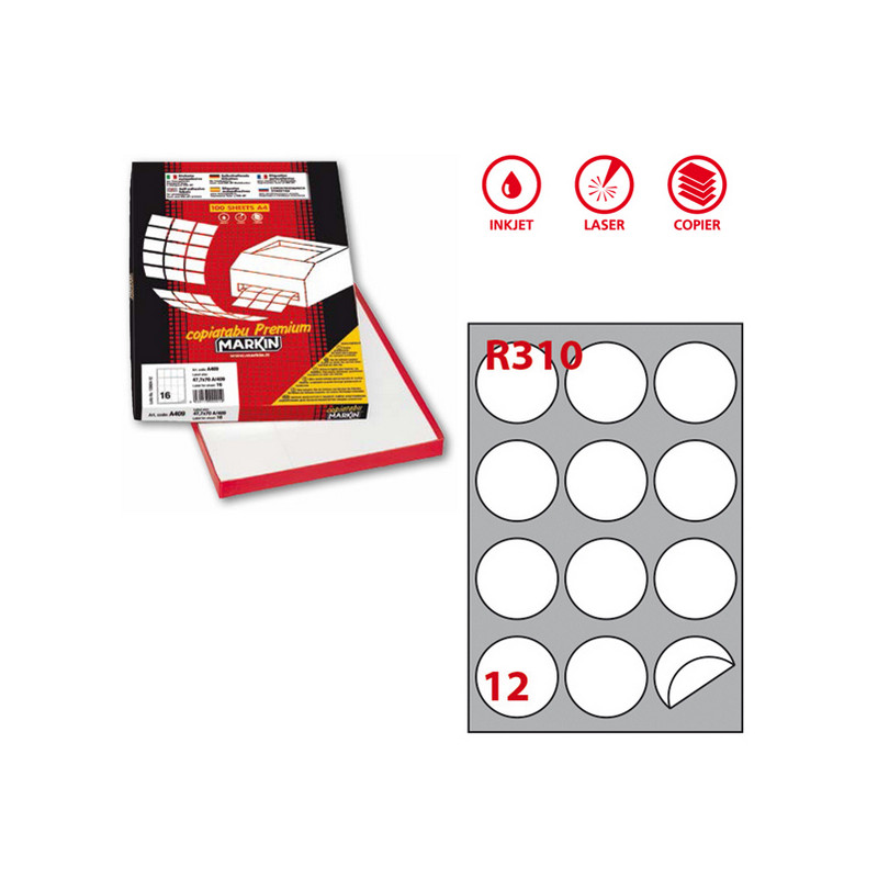 Scatola da 100fogli da 21x29,7cm (A4) di etichette in carta bianca adesive permanenti nel formato. Stampabili con stampanti inkjet, laser e fotocopiatori. 12 etichette tonde per foglio.