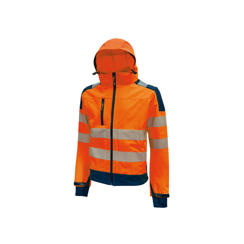 Giacca in tessuto Softshell, stretch, traspirante, antivento e idrorepellente. Due ampie tasche frontali chiuse con zip. Tasca porta cellulare su petto con chiusura zip, cappuccio staccabile con zip, maniche preformate , coulisse antimpigliamento regolabile all’interno della tasca, polsini regolabili con velcro e polsini antivento elasticizzato con buco per il pollice. Fondo sagomato. Strisce riflettenti termo-applicate su busto e braccia zip YKK. Conformità alle norme EN ISO 13688:2013 e EN ISO 20471:2013 + A1:2016.
