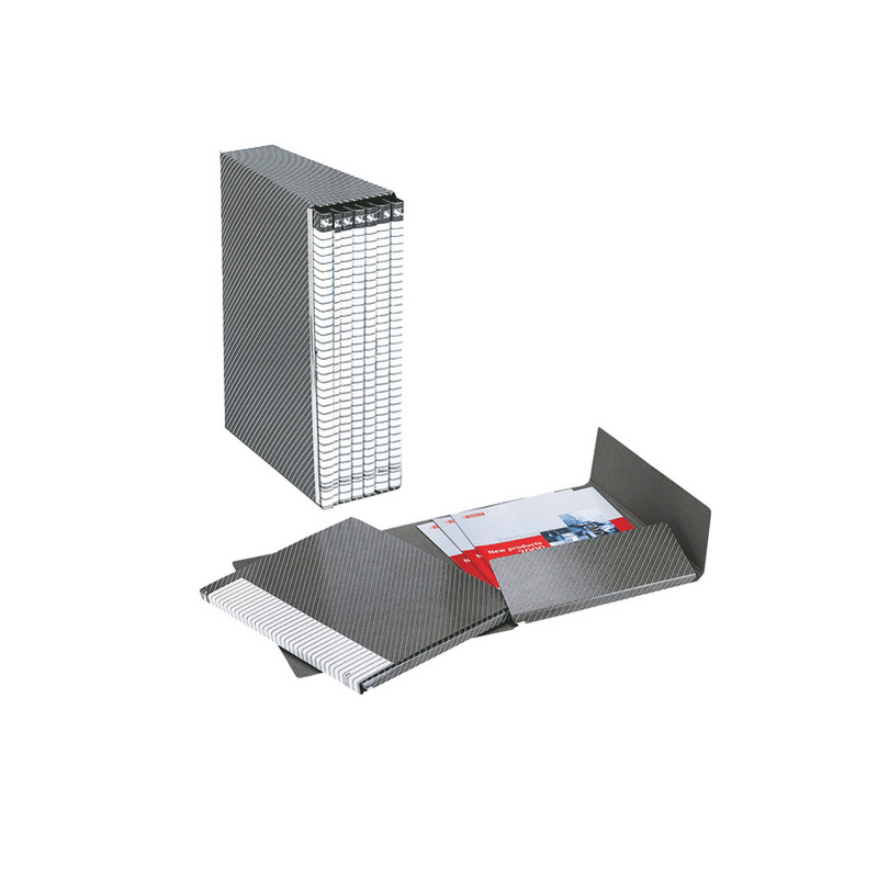 Gruppo Delso Line composto da 6 cartelle a 2 lembi (dorso 1,5 cm; dimensioni 25x32 cm) raggruppate in un'unica custodia e realizzate in robusto fibrone da 1,2 mm stampato e plastificato. La custodia, in fibrone da 0,9 mm stampato, è dotata di bande laterali metalliche di rinforzo che mantengono i bordi perfettamente diritti. Il rivestimento esterno plastificato rende tutta la superficie scrivibile; per cancellare le scritte è sufficiente utilizzare un batuffolo imbevuto di alcool denaturato o acetone. Il taglio obliquo della custodia permette infine una comoda estrazione.