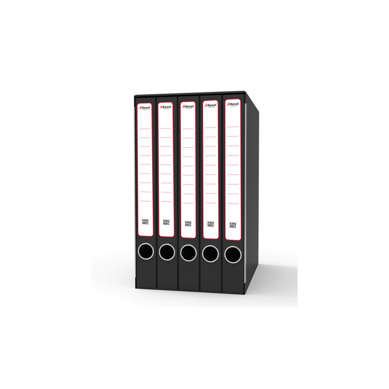 Sistema di archiviazione King Mec composto da un'unica custodia con 5 cartelline a 2 anelli (dorso 4 cm; formato utile LxH 23x32 cm). Struttura in robusto cartone grigio rivestito con carta goffrata nera antimpronta. Custodia in tinta con parabordi. Anello di estrazione in acciaio. Etichetta adesiva già posizionata sul dorso. Ideale per raggruppare fogli perforati. Dimensioni esterne 23,5x25x35 cm.