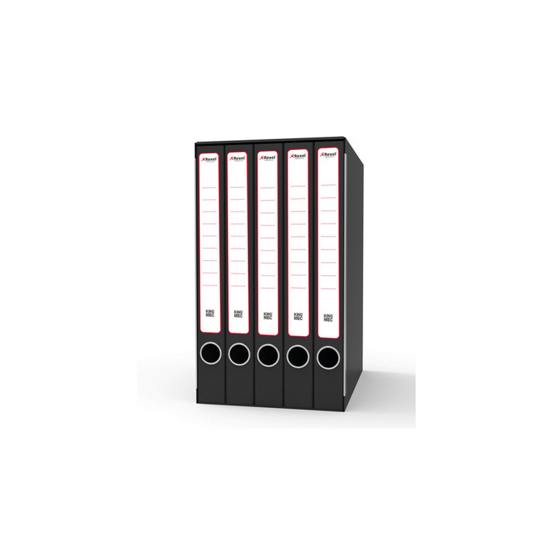 Sistema di archiviazione King Mec composto da un'unica custodia con 6 cartelline a 2 anelli (dorso 3,3 cm; formato utile LxH 23x33 cm). Struttura in robusto cartone grigio rivestito con carta goffrata nera antimpronta. Custodia in tinta con parabordi. Anello di estrazione in acciaio. Etichetta adesiva già posizionata sul dorso. Ideale per raggruppare fogli perforati. Dimensioni esterne 23,5x25x35 cm.