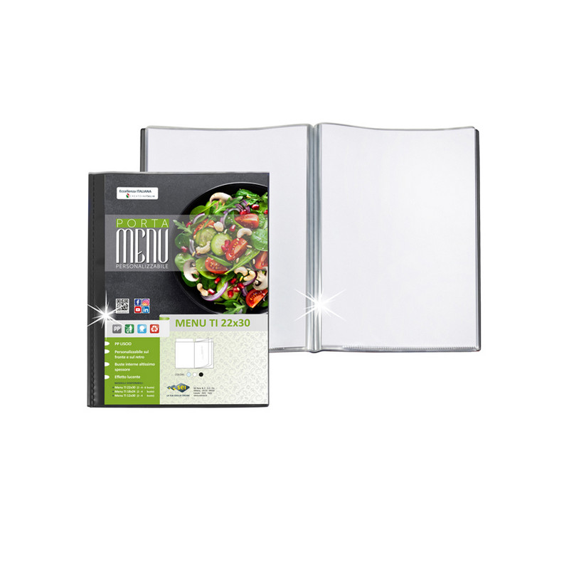Porta menu in PP liscio, altissimo spessore con due copertine personalizzabili. Disponibili a 2-4-6 buste e in tre colori: trasparente, bianco, nero. Ideali per ristoranti, pizzerie, hotels, pubs. Colore nero.
