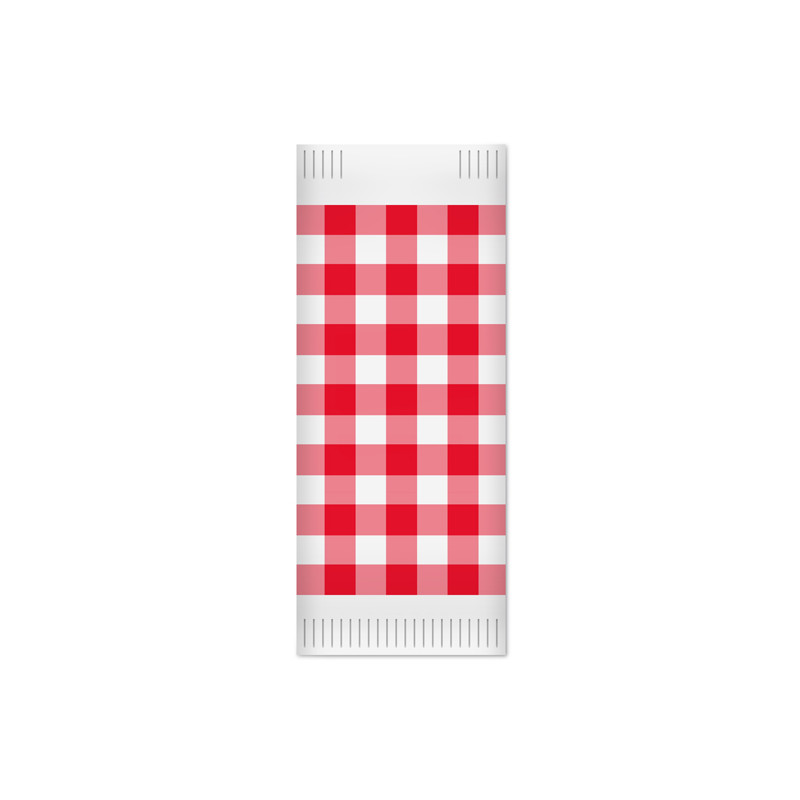 Confezione da 1000 porta posate di carta. Gamma informale in cellulosa decorata per tutti i giorni. Linea Snack Colore: quadretti rossi e bianchi. Idoneo al contatto alimentare.