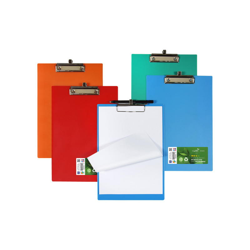 Porta blocco semplice in PP opaco riciclato e riciclabile. Con molla in acciaio dotata di portapenna estendibile. Disponibile in 4 colori assortiti: azzurro,arancione, verde e rosso.