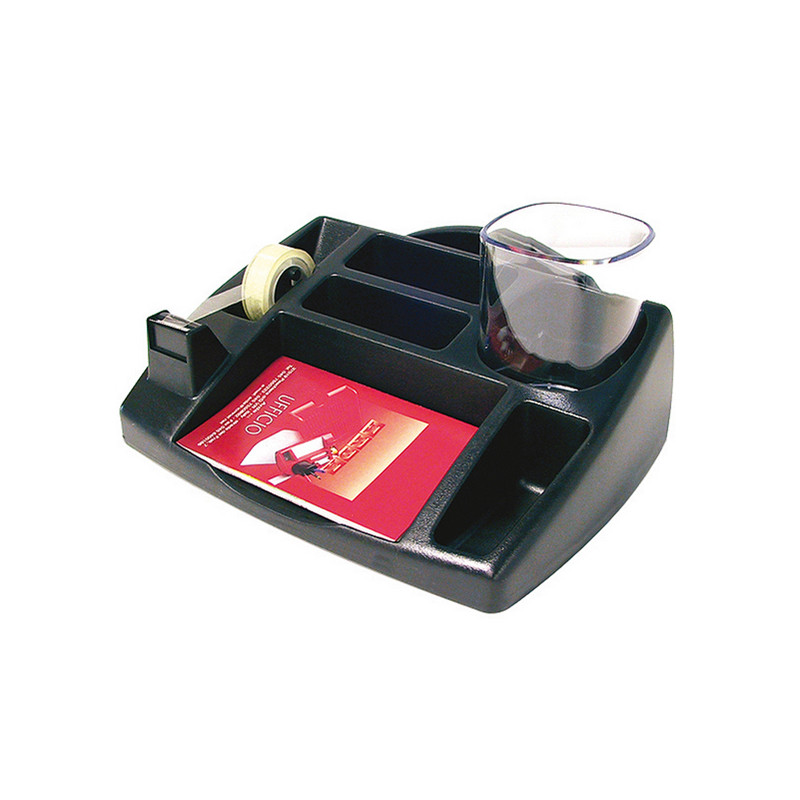 Desk Organizer Oliver struttura in polistirolo antiurto, atossico. Il portapenne può essere estratto dalla sua sede ricavando così un ulteriore vano oggetti. Porta nastro-adesivo per misura standard 19x33 mm.