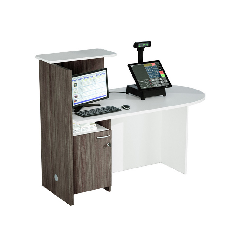 Reception ideale come postazione cassa in negozi, centri estetici ecc. o come reception in ambulatori, cliniche e ovunque sia necessaria una postazione di ricevimento confortevole ma compatta. Dotata di bancone con piano sagomato a DESTRA 140x83xH73,3cm (sp. 25 mm). Mensola superiore 64x30cm sp. 18mm (H42cm dal piano). Due ripiani L38,2cm sotto il desktop. Fianco (sp. 25mm) con foro passacavi in corrispondenza del ripiano inferiore. Bicolore bianco/frassino toscano.