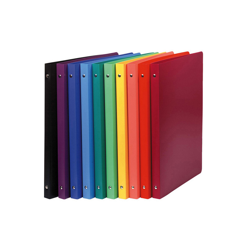 Raccoglitore in polipropilene opaco coprente (spessore 0,7 mm). Formato utile 242x297 mm (A4 Maxi). Meccanismo a 4 anelli tondi (diametro 30 mm). Dorso 40 mm. Capacità 275 fogli da 80 gr/mq. 10 colori assortiti (blu chiaro, blu scuro, giallo, nero, arancio, rosa, rosso, verde chiaro, verde scuro, viola). Formato esterno 268x320 mm.