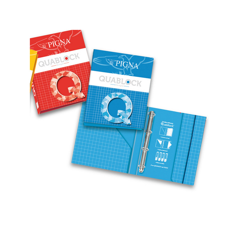 Raccoglitori ad anelli Quablock realizzati in cartone robusto ed anelli in acciaio cromato. Dotati di tasche interne ed elastico per la chiusura. Dispositivo 4 anelli, tondi. Colori assortiti. Formato anelli 30mm di diametro. Formato A4.