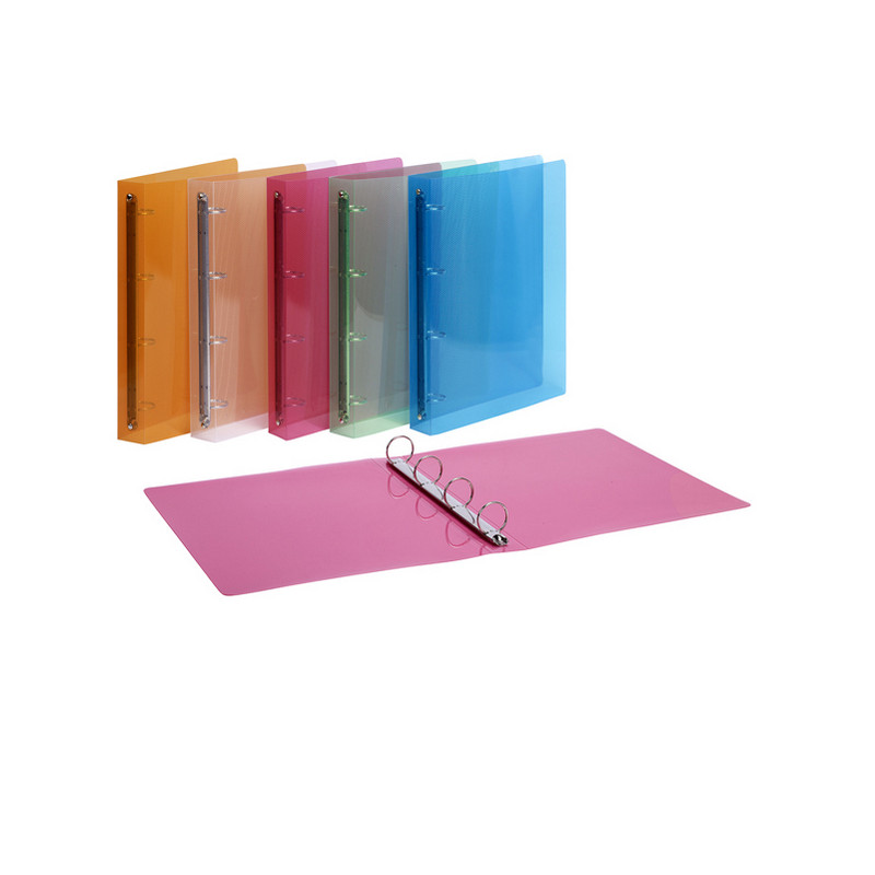 Realizzati in polipropilene colorato con speciale finitura rigata. Disponibili in 5 colori: arancio, fucsia, verde, azzurro e neutro. Formato interno 22x30cm. Dotati di meccanismo a 4 anelli tondi con Ø15mm e Ø30 mm. Made in Italy.