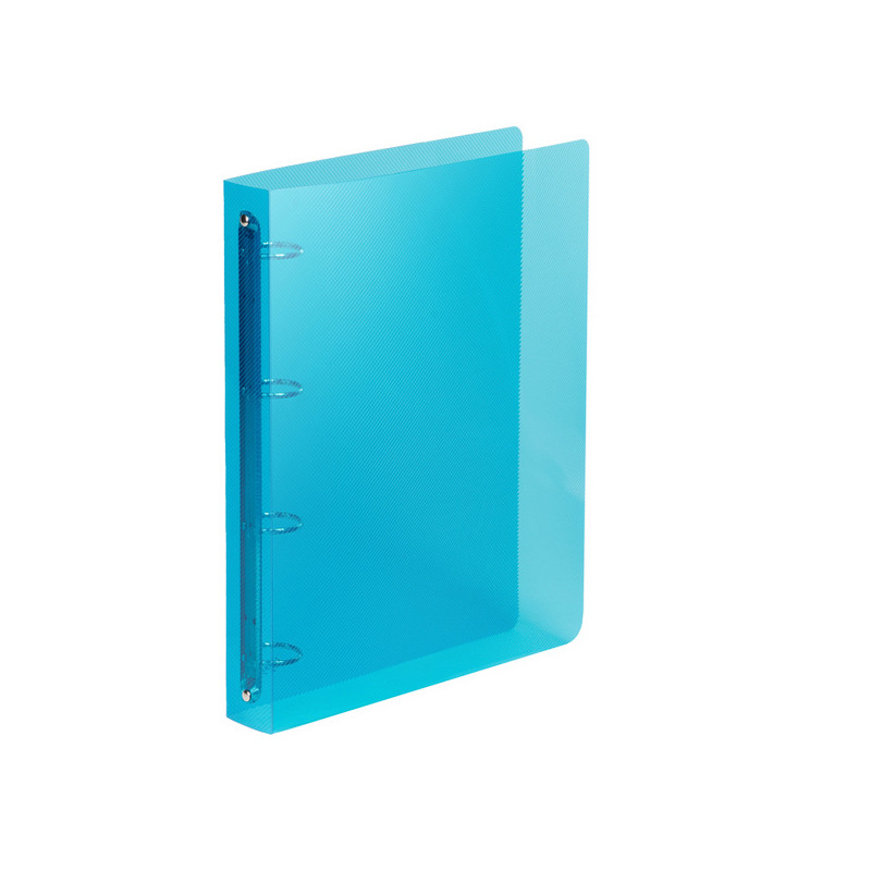 Realizzati in polipropilene colorato con speciale finitura rigata. Disponibili in 5 colori: arancio, fucsia, verde, azzurro e neutro. Formato interno 22x30cm. Dotati di meccanismo a 4 anelli tondi con Ø15mm e Ø30 mm. Made in Italy.