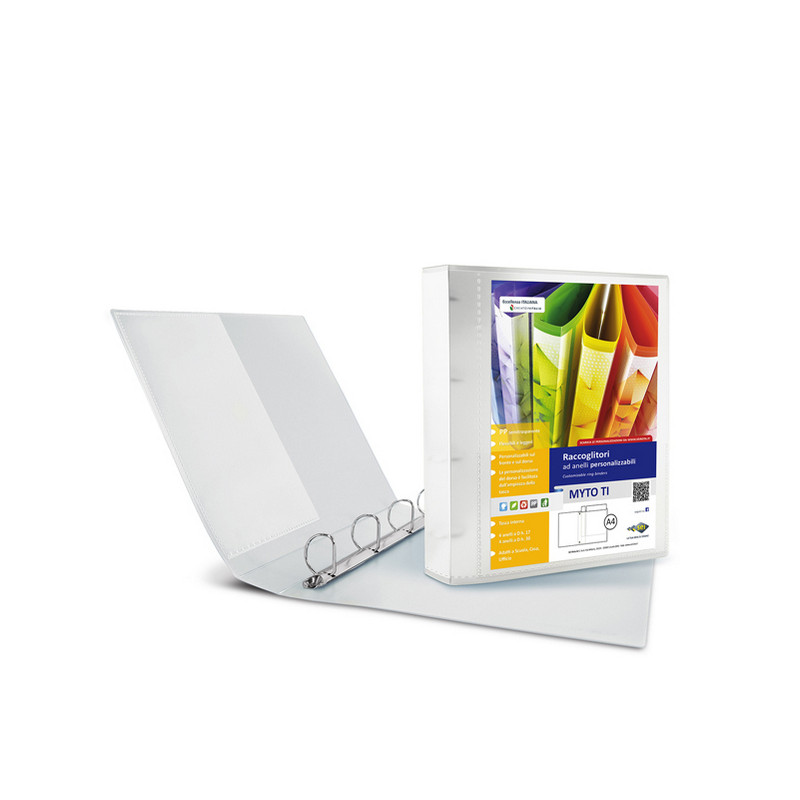 Raccoglitore personalizzabile in polipropilene colorato semitrasparente, con meccanismo a 4 anelli (a D). Dotato di tasche trasparenti sul 1° quadrante, sul dorso e all'interno. Inserimento facilitato della personalizzazione del dorso. Formato esterno: 275x320 mm. Formato contenuto: 220x300 mm (A4). Dorso: 40 mm. Diametro anelli: 30 mm. Colore neutro.