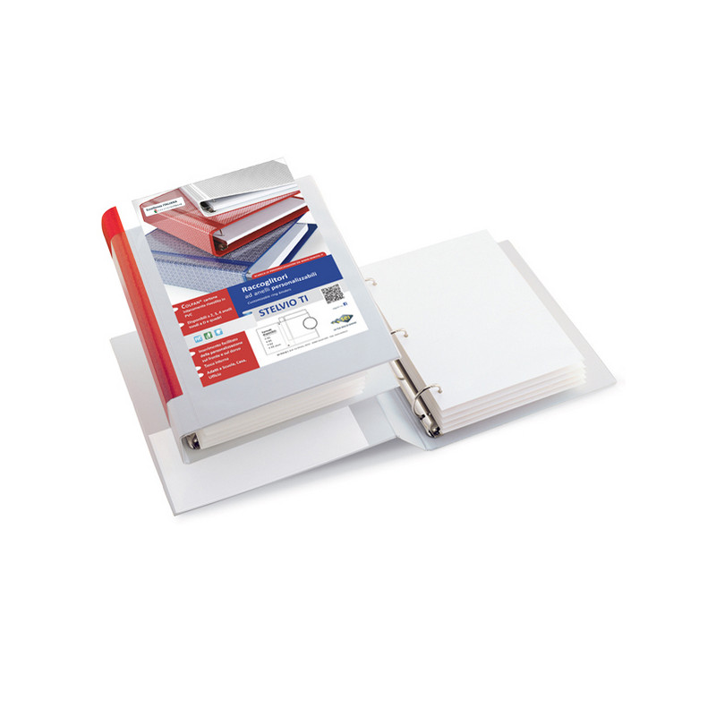 Raccoglitore personalizzabile in Colpan® (cartone rivestito in PVC) con meccanismo a 3 anelli (a D). Dotato di tasche trasparenti sul 1° quadrante e sul dorso. Inserimento facilitato della personalizzazione del dorso. Tasca interna non presente. Formato esterno: 205x225 mm. Formato contenuto: 150x210 mm (A5). Dorso: 50 mm. Diametro anelli: 30 mm. Colore bianco.