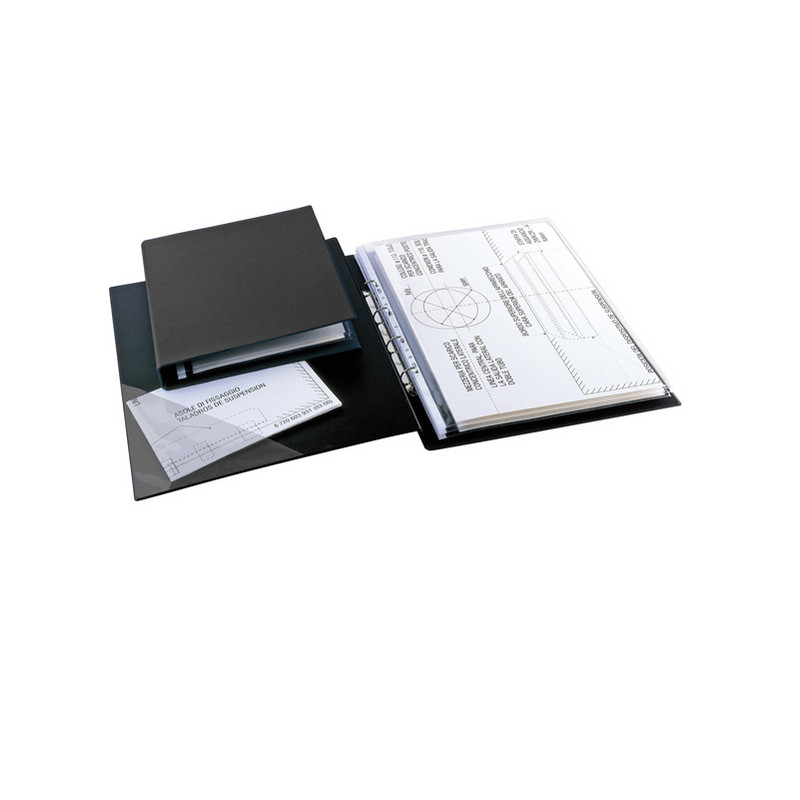 Raccoglitore in Colpan 2000® (cartone rivestito in PVC espanso), spessore 1 mm, con meccanismo a 4 anelli (a D) e tasca interna trasparente. Adatto a contenere documenti, disegni, poster, cartine geografiche, cartelli pubblicitari, stampe. Destinato a durare nel tempo. Formato esterno: 480x315 mm. Formato contenuto: 420x300 mm (A3 libro, anelli sul lato lungo).