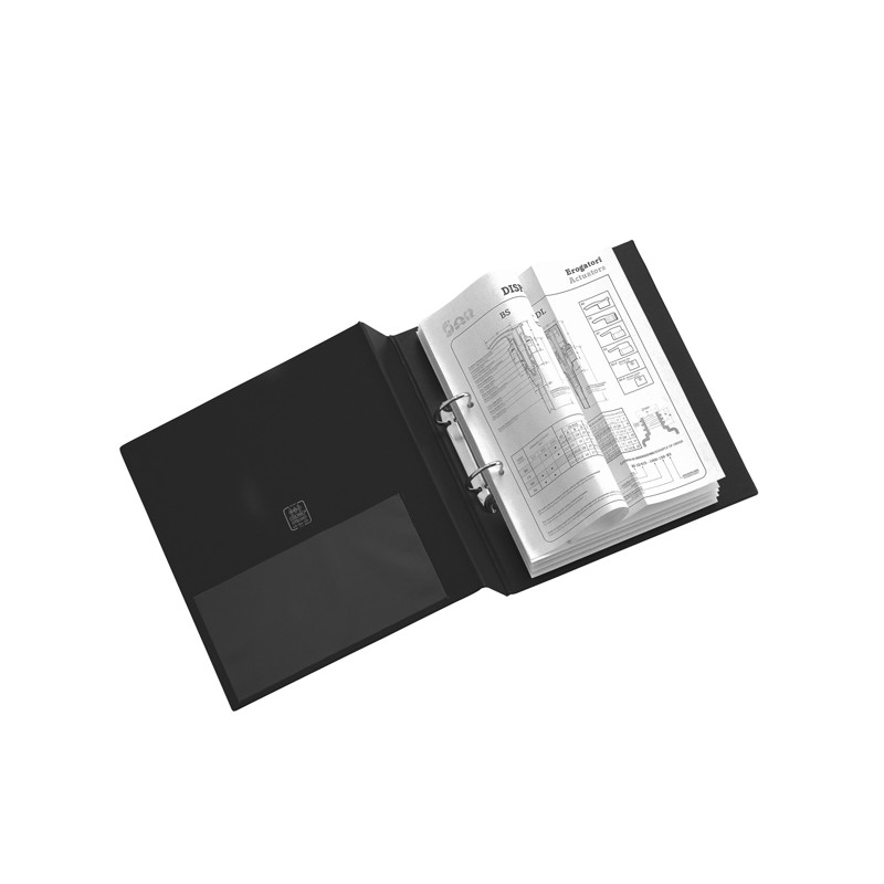 Raccoglitore in Colpan® (cartone rivestito in PVC) con meccanismo a 2 anelli tondi e tasca interna trasparente. Ideale per archiviare qualsiasi tipo di documento. Formato esterno: 265x310 mm. Formato contenuto: 220x300 mm (A4). Dorso: 30 mm. Diametro anelli: 25 mm. Colore nero.