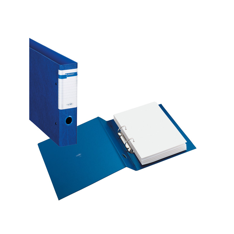 Raccoglitore ad album in Colpan® (cartone rivestito in PVC) con meccanismo a 2 anelli (a D). Dotato di finestrino avvolgente con etichetta e di occhiello per l'estrazione in tinta. Formato contenuto: 300x220 mm (A4 album). Diametro anelli: 40 mm. Colore blu.