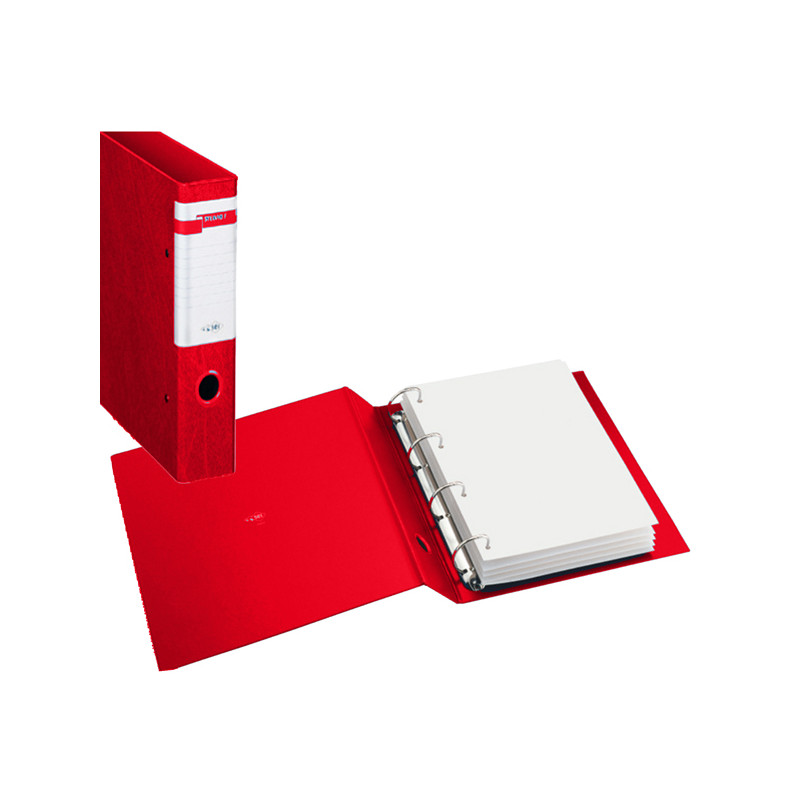 Raccoglitore in Colpan® (cartone rivestito in PVC) con meccanismo a 4 anelli (a D). Dotato di finestrino avvolgente con etichetta e di occhiello per l'estrazione in tinta. Ideale per archiviare documenti di frequente consultazione. Formato esterno: 260x310 mm. Formato contenuto: 220x300 mm (A4). Dorso: 35 mm. Diametro anelli: 25 mm. Colore rosso.