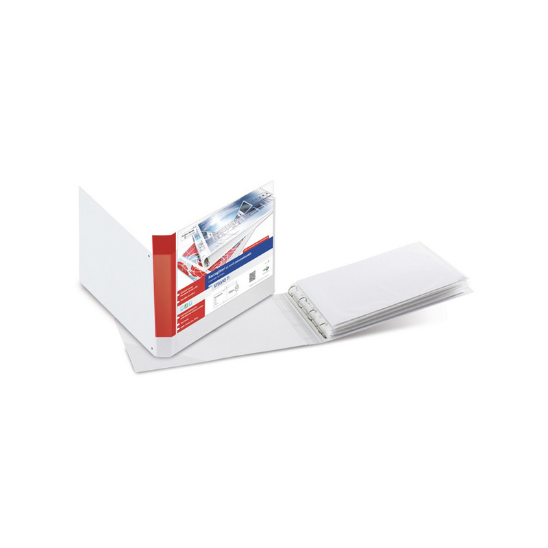 Raccoglitore bianco personalizzabile in Colpan¨ (cartone rivestito in PVC) con meccanismo a 4 anelli a D e tasca interna. Dotati di tasche trasparenti sul I° quadrante e sul dorso. Inserimento facilitato della personalizzazione nel dorso. Formato esterno: 480x315mm. Formato contenuto: 420x300mm(A3 album). Dorso 40mm. Anelli a D 4 da 40mm.