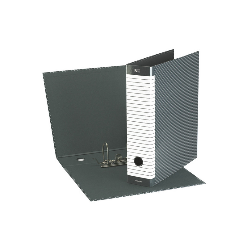 Registratore con ampio dorso riscrivibile per la massima personalizzazione. Robusta struttura in cartone (spessore 2 mm) rivestita in carta stampata e plastificata. Dotato di foro per l'estrazione e meccanismo a leva con 2 anelli. Resistente custodia da 0.9 mm in fibrone con bordi metallici rinforzati.
