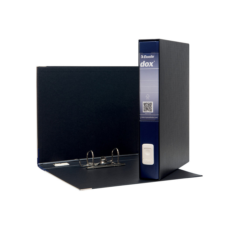 Struttura in cartone rivestito con carta goffrata antimpronta e rifinito con paralati metallici alla base della plancia. Custodia in fibrone rivestito con carta nera goffrata trattata antimpronta, interno nero e parabordi verniciati. Meccanismo a leva in acciaio nichelato con pressino. Dorso in materiale plastico colorato e portaetichette trasparente con etichetta reversibile.