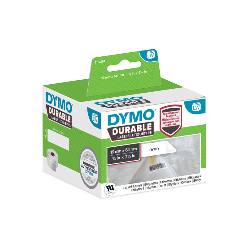 Rotolo di etichette permanenti LabelWriterTM DURABLE in polipropilene resistenti allo strappo con adesivo extra-lungo resistente all 'abrasione, ai comuni detergenti e a un'ampia gamma di temperature. Ideali per scaffali, archivi e segnaletica.