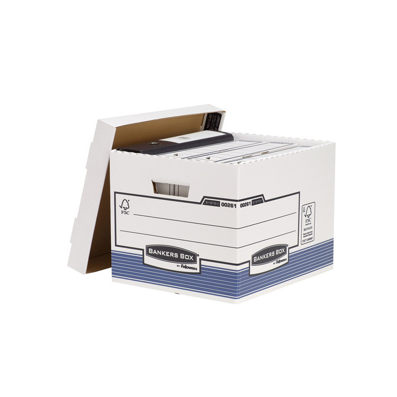 Scatola archivio in cartone 100% riciclato. 100% inchiostri a base d'acqua, 100% colle prive di solventi, 100% riciclabili. Coperchio sovradimensionato permette l'uso con cartelle sospese. Formato utile L333 x H285 x P390mm