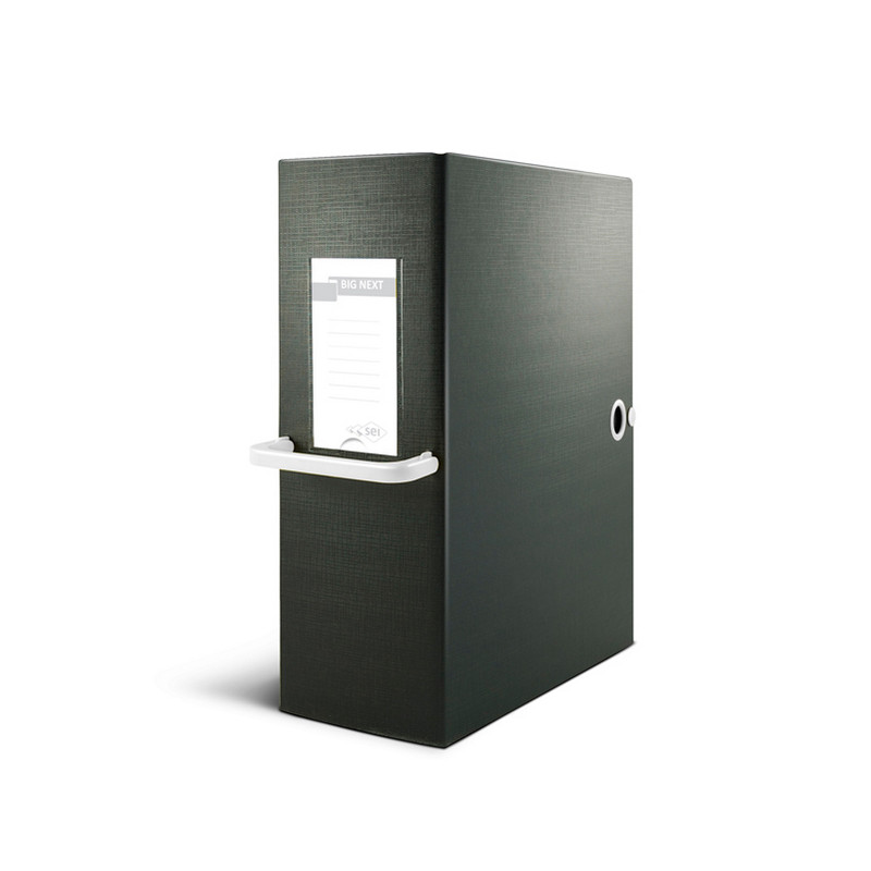 Cartelle in Colpan® nero (cartone rivestito in PVC) con chiusura a tre lembi. Maniglia in plastica bianca. Occhiello e bottoni automatici in metallo nel colore della maniglia. Etichetta intercambiabile colorata. Adatte per l'archiviazione e il trasporto di progetti, disegni, documenti e cartelline. Formato esterno: 260x360mm. Formato contenuto:250x350mm. Dorso 16cm.
