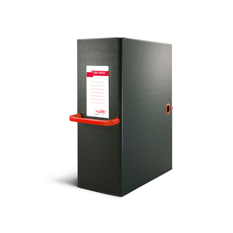 Cartelle in Colpan® nero (cartone rivestito in PVC) con chiusura a tre lembi. Maniglia in plastica rossa. Occhiello e bottoni automatici in metallo nel colore della maniglia. Etichetta intercambiabile colorata. Adatte per l'archiviazione e il trasporto di progetti, disegni, documenti e cartelline. Formato esterno: 260x360mm. Formato contenuto:250x350mm. Dorso 16cm.