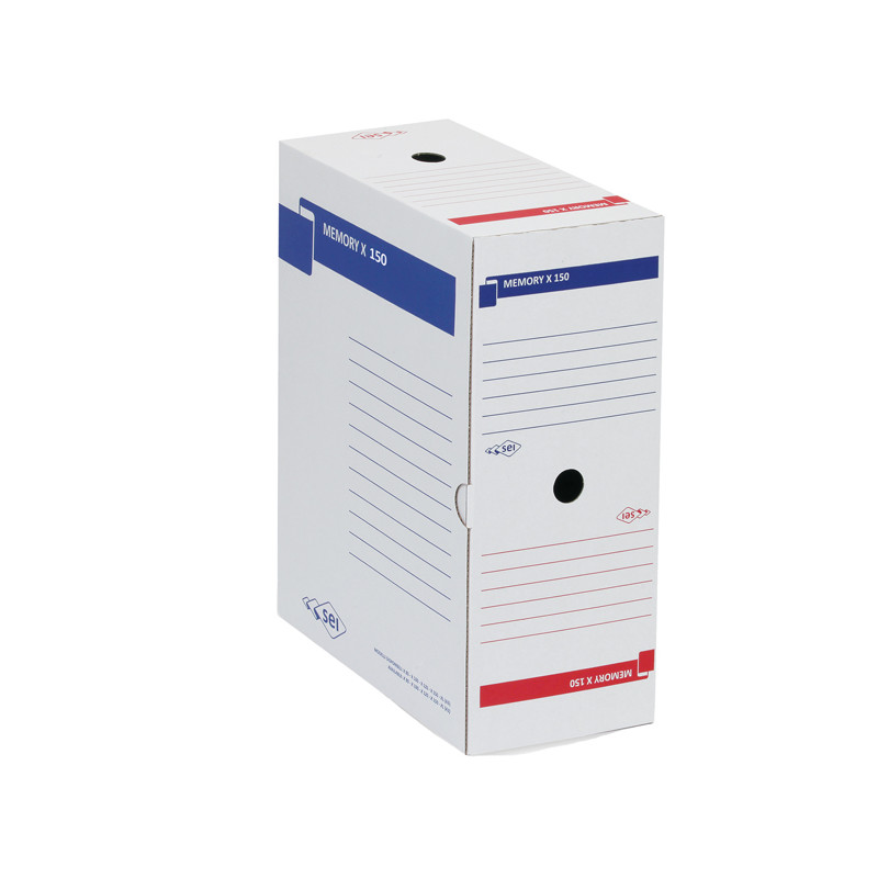Scatole in cartone riciclato al 90% rivestito in kraft bianco. La speciale struttura ad alta resistenza permette una durata maggiore. Montaggio automatico. Archiviabili in 3 posizioni e dotate di 3 fori d'estrazione. Stampa a due colori con inchiostri a base d'acqua. Le colle utilizzate non contengono solventi. Formato esterno: 260x360mm. Formato contenuto: 250x350mm. Dorso 150mm.