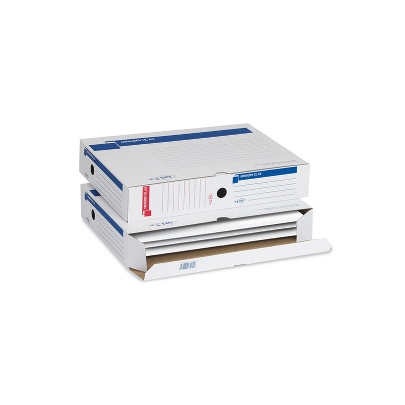 Scatole in cartone riciclato al 90% rivestito in kraft bianco. La speciale struttura ad alta resistenza permette una durata maggiore. Montaggio automatico. Archiviabili in 3 posizioni e dotate di 3 fori d estrazione. Stampa a due colori con inchiostri a base d'acqua. Le colle utilizzate non contengono solventi. Formato esterno: 305x430mm. Formato contenuto: 300x420mm(A3). Dorso 80mm .