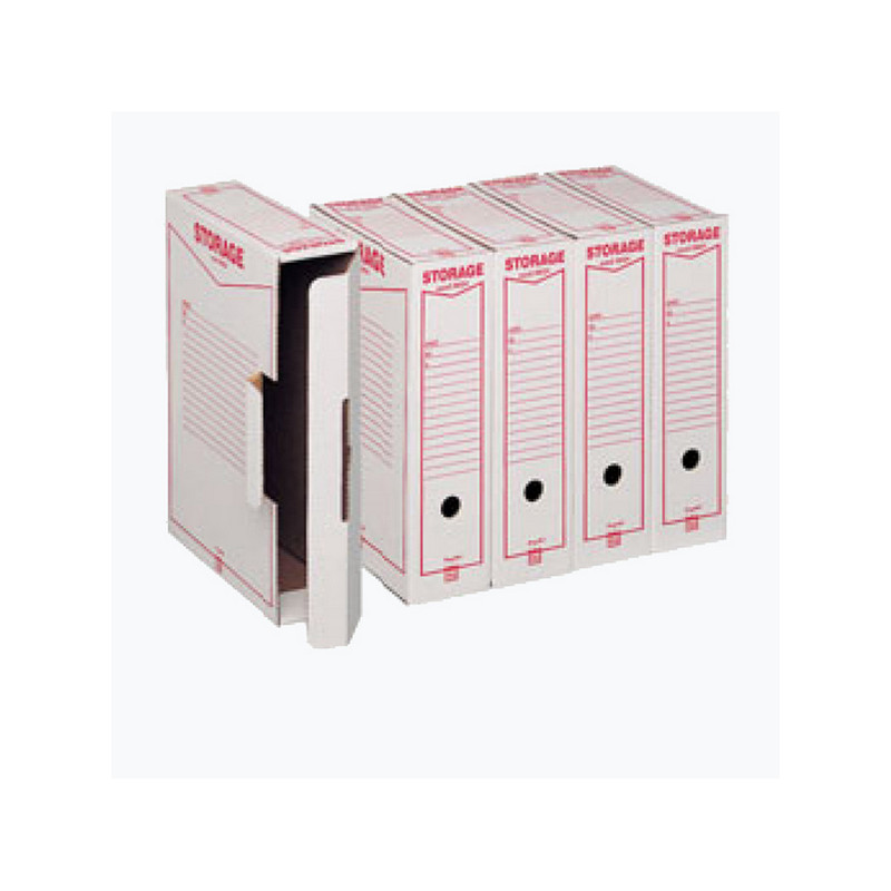Scatole in cartone rigido bianco stampato. Archiviabili sia in orizzontale che verticale, foro di presa sul lato lungo e corto. Dimensioni esterne LxHxP 9x37x26cm. Formato utile LxHxP 8,5x25,3x35,5cm contiene formato legale. Confezionde da 32 scatole.