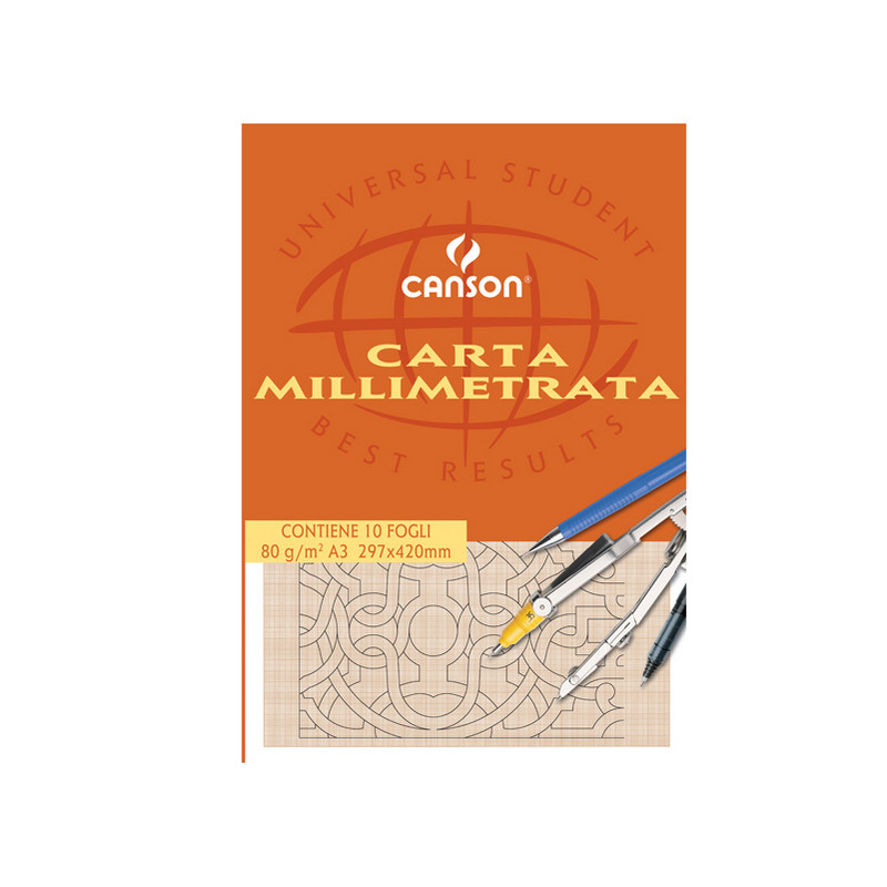 Carta trasparente opaca millimetrata Canson da disegno. Si presta in particolare agli usi tecnici e manuali, a matita ed ad inchiostro. In formato A3 da 80gr/m, quadrettatura colore arancio.