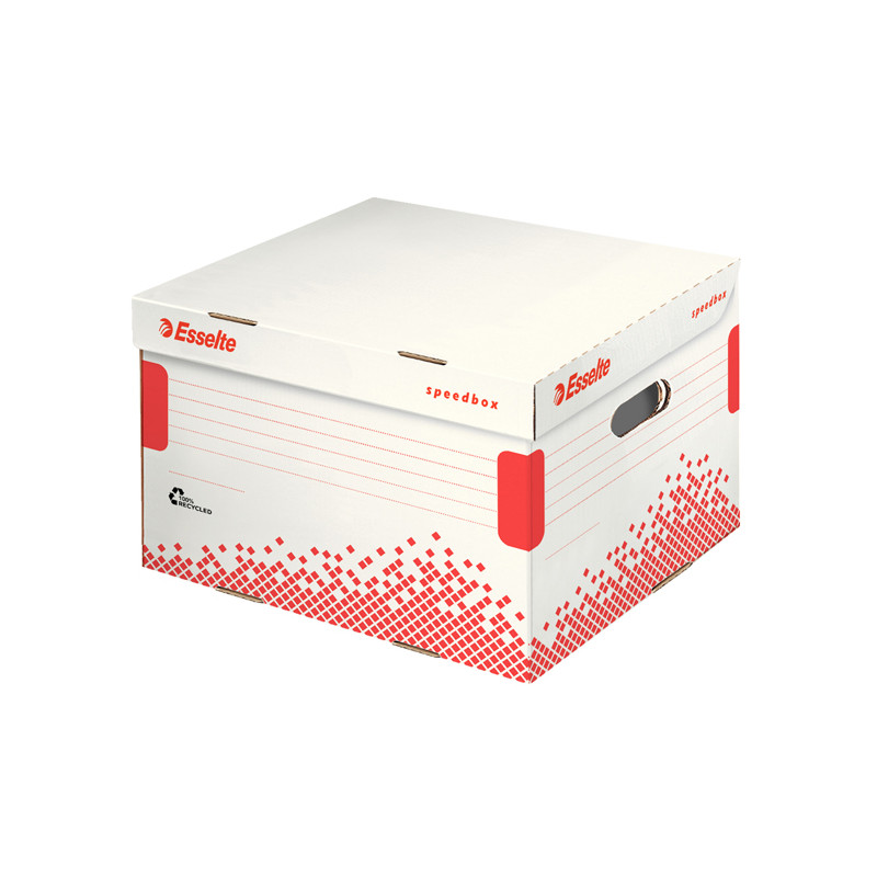 Scatole archivio di alta qualità dotate di un sistema di assemblaggio facile e veloce e AUTOMONTANTE. Dotate di doppia chiusura sul dorso per evitare rotture del foro di presa; doppie pareti e doppio fondo per la massima tenuta. Realizzate con il 100% di cartone riciclato e riciclabile. Certificate FSC. Small - 25,2x35,5x19,3cm