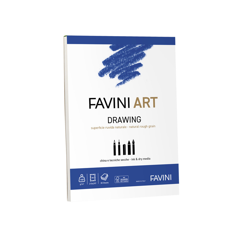 Blocco adatto a diverse tecniche secche come matite, pastelli, china, carboncini, gessi, sanguigna e altre tecniche a secco. La carta del blocco Drawing possiede una grana fine e un ottimo punto di bianco che dona brillantezza ai colori offrendo un buon contrasto nei chiaroscuri.