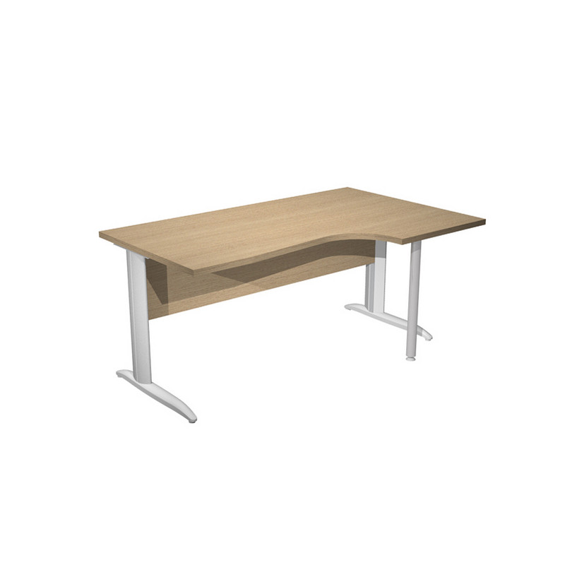 Scrivania compact destro sagomata con fianchi metal ad L verniciati colore grigio alluminio. Spessore 22mm. Completi di canalina passacavi e piedini regolabili in altezza e supporto metal. Desktop con bordo anti urto in ABS da 3mm. Dimensioni: 160x80/100x72cm. Piano rovere.