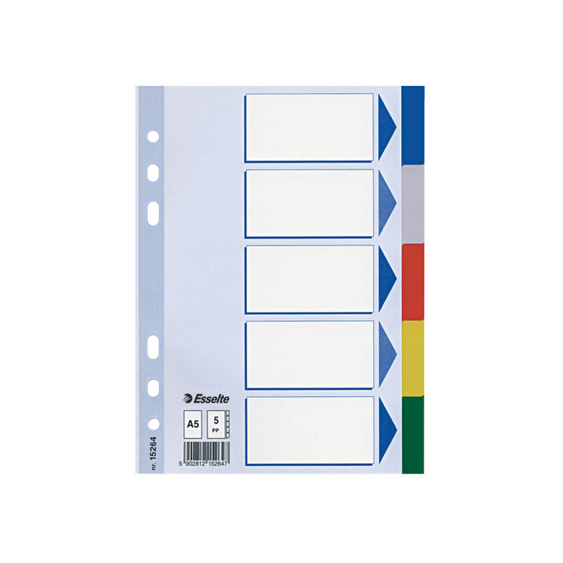 Separatori in Polipropilene colorato dotati di 5 tasti neutri multicolore. Indice frontale prestampato realizzato in cartoncino e rinforzato in Mylar sul lato forato. Perforazione universale. Formato A5.