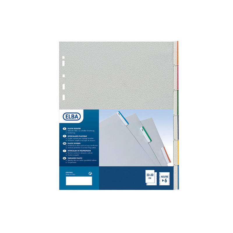 Divisori realizzati in Polipropilene di colore grigio da 120micron. Dotati di 6 tacche neutre e di un cartoncino stampato e fustellato per la personalizzazione delle tacche.