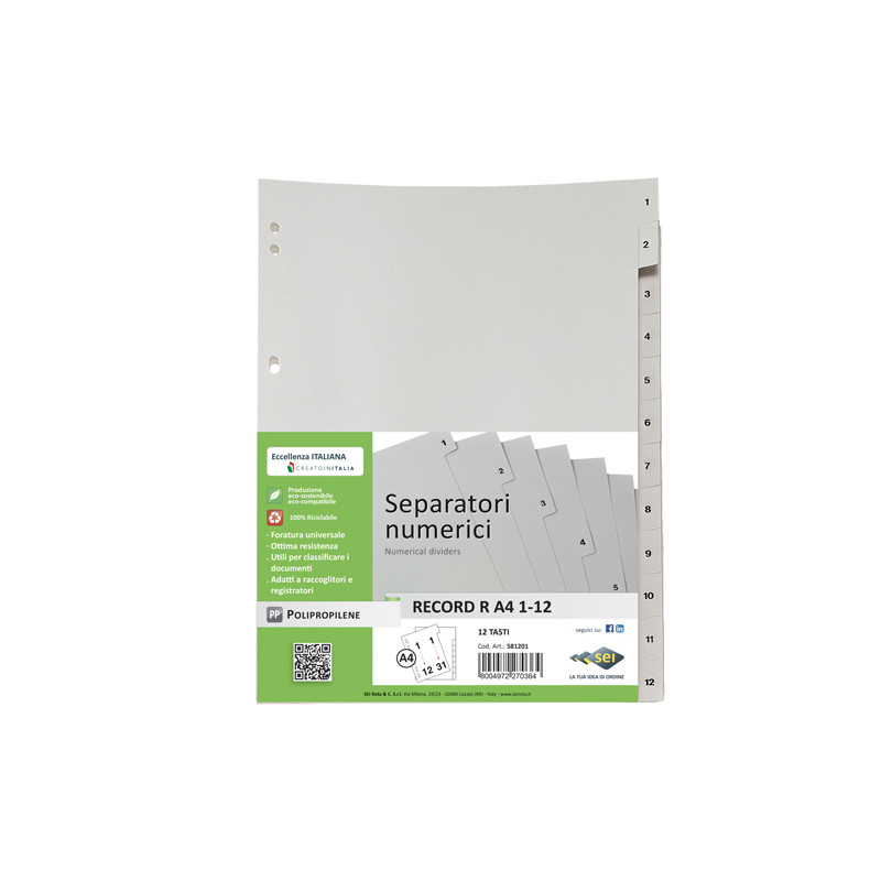 >Cancelleria>Separatori>Separatore numerico 1/12 Record R - PP - 21 x 29.7 cm - A4 - Sei Rota