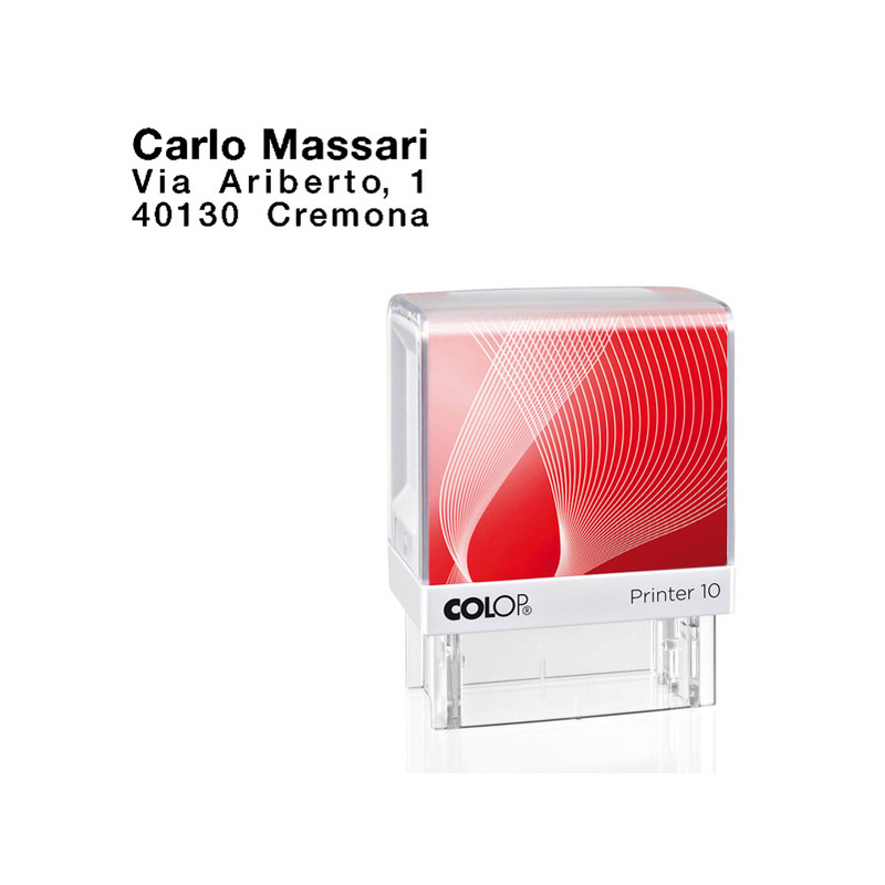 Timbro Printer 10 G7 autoinchiostante. Compatto con nuova montatura in ABS antiurto. Ampio spazio per individuazione del timbro. Dotato di tampone inchiostrato di colore nero. Personalizzabile su 3 righe con logo, indirizzo o altro testo. Area stampa 10x27mm. Tampone di ricambio E/10.